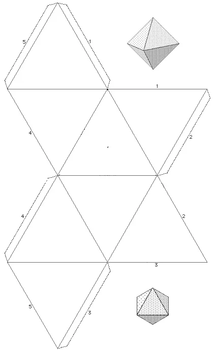 Un octaedru regulat se poate obtine dintr-un cub unind centrele fetelor acestuia. In figura de mai sus puteti vedea o reprezentare tridimensionala care demonstreaza aceasta propietate. De asemenea un cub se poate obtine dintr-un octaedru regulat repetand procedeul